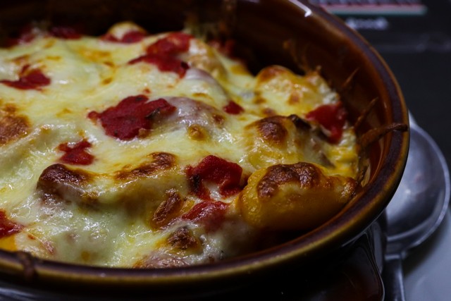 Φρέσκα ζυμαρικά πατάτας, σάλτσα ντομάτας, μπέικον & μοτσαρέλα.