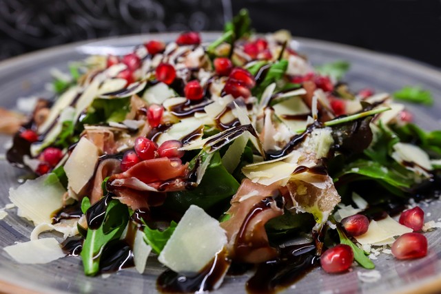 Σάλτσα ντομάτας, μοτσαρέλα, προσούτο, μανιτάρια porcini, ρόκα & φλέικς παρμεζάνας.